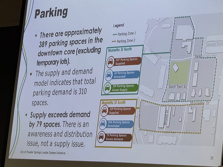Presenters also shared the results of last month’s LCI open house, and also the city’s findings that its downtown area has more parking spaces than currently needed — an estimated 389 parking spaces versus a parking demand of 310 spaces. But it also found that there is “an awareness and distribution issue” because there is excess supply of parking north of Marietta Street (the main street that runs through downtown) but excess demand south of Marietta Street. Potential solutions they suggest are integrating parking into new development, optimize existing capacity, and using streetscape improvements as a solution.